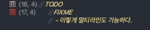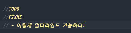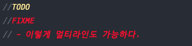 의외로 간단했다. 주석달고 //TODO나 //FIXME를 통해서 색반전이 되면서 더 가독성이 높아진다. 그리고 또한 멀티라인을 사용하고 싶은경우 -를 앞에 붙혀주면 멀티라인도 가능하다.