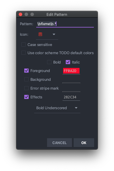 특정 패턴도 수정할 수 있고, Use Color scheme TODO default colors를 체크아웃하면 나만의 특정 색으로 변경도 가능하다. 다음처럼 빨간색을 변경시키면,